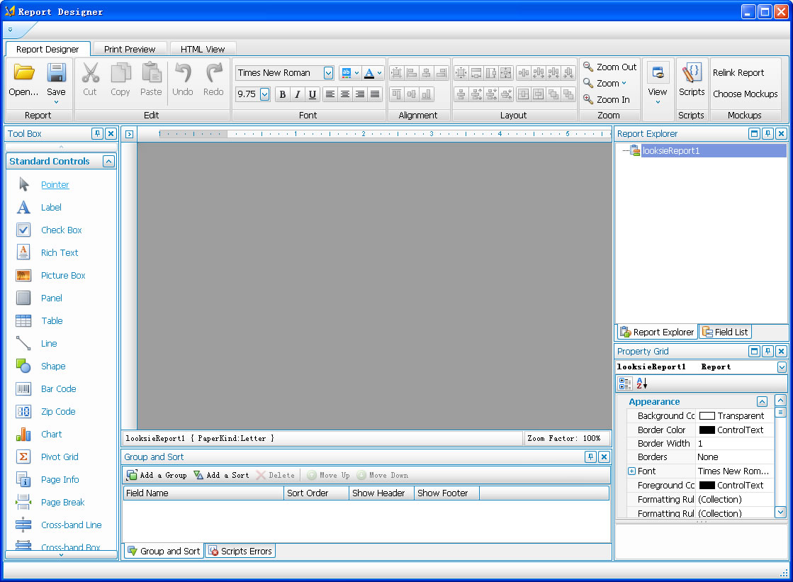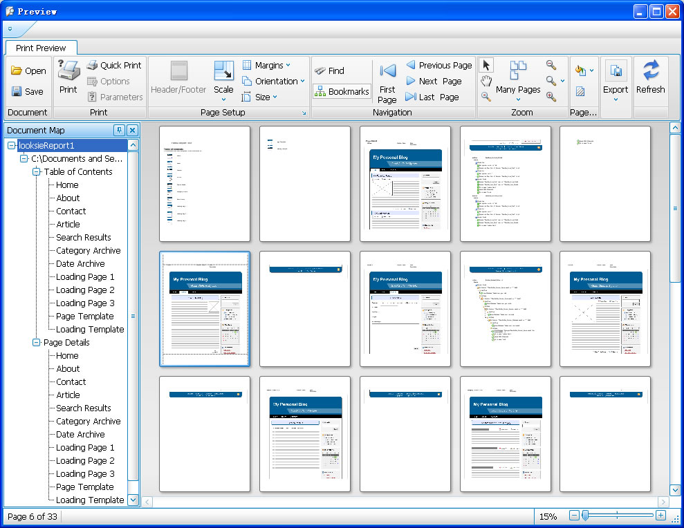 The report preview window will shows up once you click the “Run Report” button. In this window you can review the content report page by page (just like browsing a World document). You can save the report to .prnx file so that you can open and review it with Looksie. You can also print the report to papers or export the report to many formats, such as PDF, HTML, RTF, XLS etc.