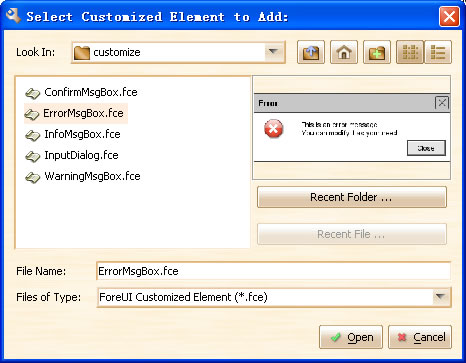 has the same effect than clicking the Add Element from FileActually this option will not create any new element, but it allow you to load an existing ForeUI customized element file (*.fce) and add it into the category immediately. So it is possible to download some customized elements from internet and use them in your own design. We can also preview the element during the selecting:
