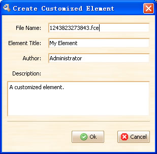 Here we can specify the basic info of the element, also we can input the name of the file to save the element. The element will be saved as "<FCE_DIR>/filename.fce" file, where the <FCE_DIR> is the "customize" folder under the installation directory. The new created element will be added to the category and be shown immediately. You can now drag the new element into any plot. When we right click the selection in editing area, there