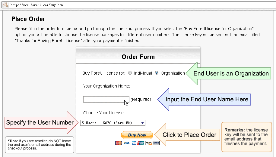 You can checkout via PayPal, RegNow or Avangate, all of them can directly accept your credit card or bank card. If you are reseller and want to buy ForeUI for your client, this figure introduces the steps. Need help for placing order? Please contact us via sales@foreui.com. If you have license key that is older than one year, you can renew your ForeUI license with 50% discount. |