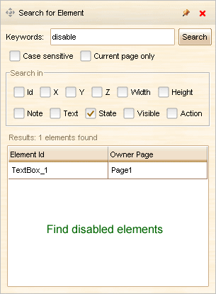 You can input keywords and press the "Search" button (or press ENTER on keyboard) to start the searching. If you have multiple keywords, you can separate them with spaces or commas. Please remember: if you input several keywords, the element will not be listed until it satisfy all keywords. For example, you use two keywords: "Text" and "Edit", then search in Id, the search results will contain all TextEditBox elements, but no TextBox element will be listed.
