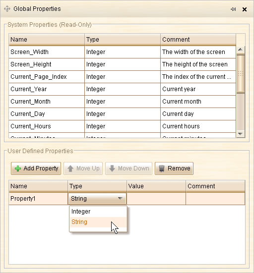 Here you can review the system properties and create user defined properties. These properties can be used in expression when defining the behavior.