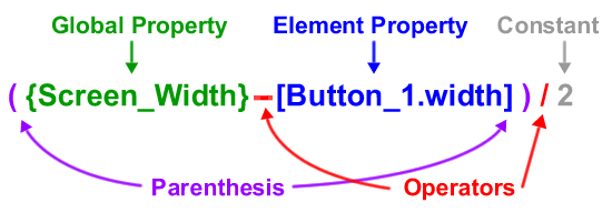 An expression can contain constants, properties (element property or global property) parenthesis and operators. The figure below shows an example of expression: