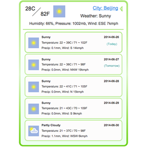 This is a fully functional web application that could display the current condition and forcast the weather for 5 days. By default the app will get your city by your IP address and automatically query the weather information for you. You can click the city name to input the city too. This small web can be placed in the dashboard of Mac OS X (as a Web Clip), or get loaded in any web browser on desktop or mobile phone.