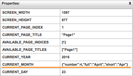 What’s more, the existing {“CURRENT_MONTH”} system property gets changed to object type too, to include different display formats as well. The figure below shows the new content of this system property in the HTML5 simulation.