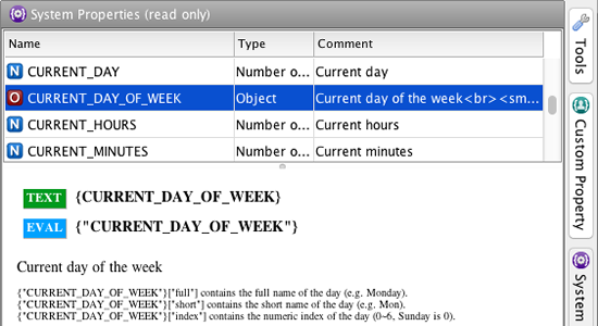 Since this new version, you can use the new {CURRENT_DAY_OF_WEEK} system property, which is an object type property and contains the current day of week in different display formats, as shown below: