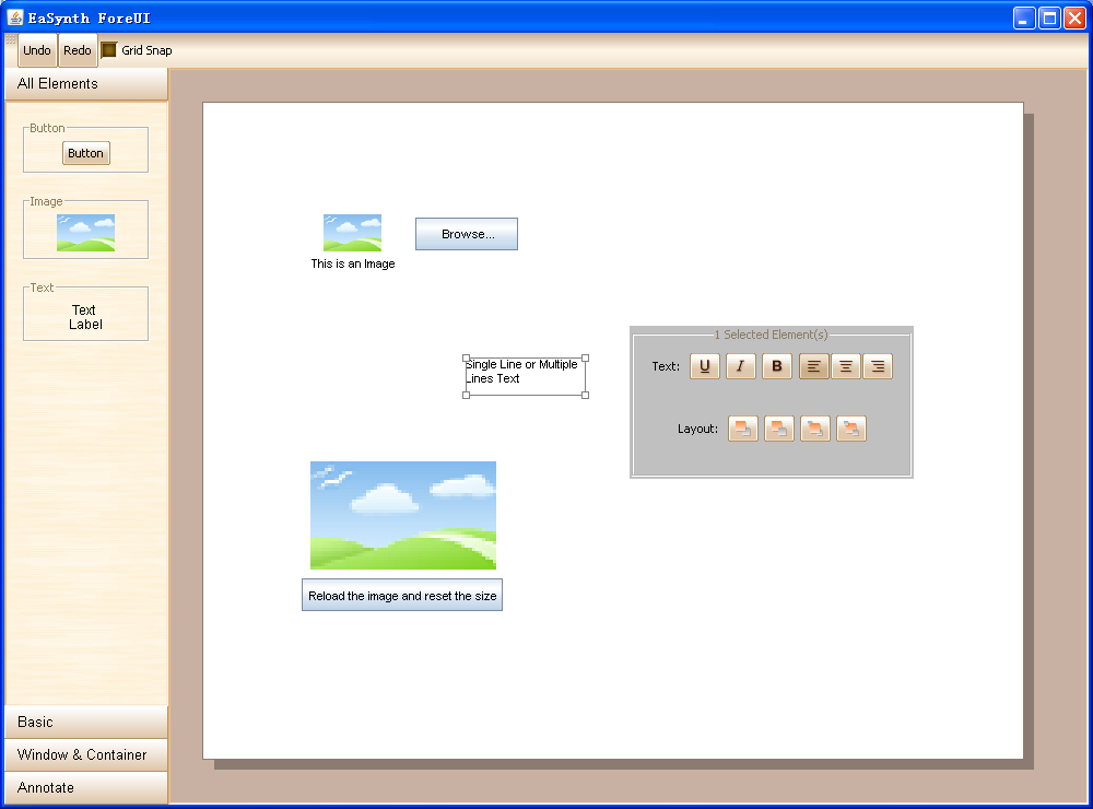 So far the progress is good, the application can support 3 kinds of basic elements now: Button, Text and Image. The editing area can support multiple selection, drag-and-drop to move or resize the selection, snap the movement and resizing to grids… We want to make it user-friendly, and we hope our advisors will also think so:-)