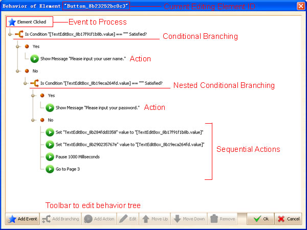 The key point to create interactive prototype is to define the behavior of element, i.e. create a tree structure to represent the workflow of event handler, like the figure below: