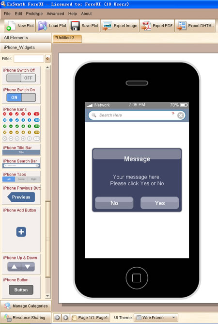 The library will be deployed automatically after the downloading, and you will find a new “iPhone_Widgets” element category on the left of ForeUI window.  Then you can use the new elements inside for iPhone app wireframing.