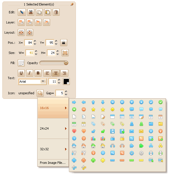 Yes we can input that “[img1]” in the button text to assign an icon for it, but we don’t have to do so, since we have more convenient approach: specify the image in the floating tool panel, see the figure below: